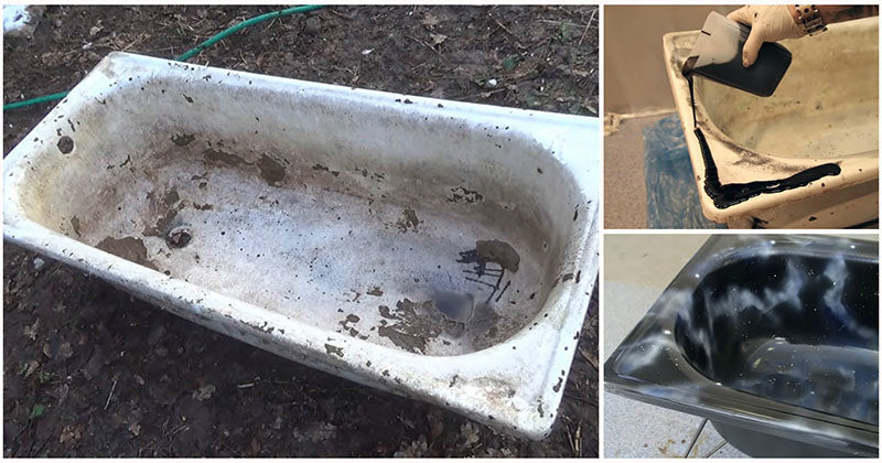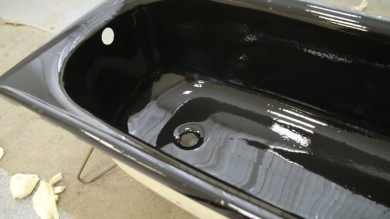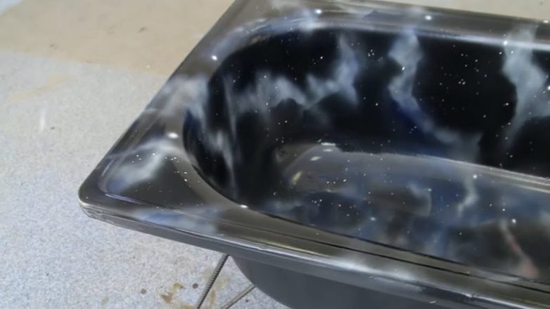 Главный момент в работе — заливка. Мастер подложил под низ ванны пакеты и стал заливать ванну жидким акрилом. Цвет может быть выбран тот, который вам больше нравится. Мастер решил сделать нестандартную чёрную ванну.