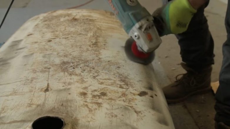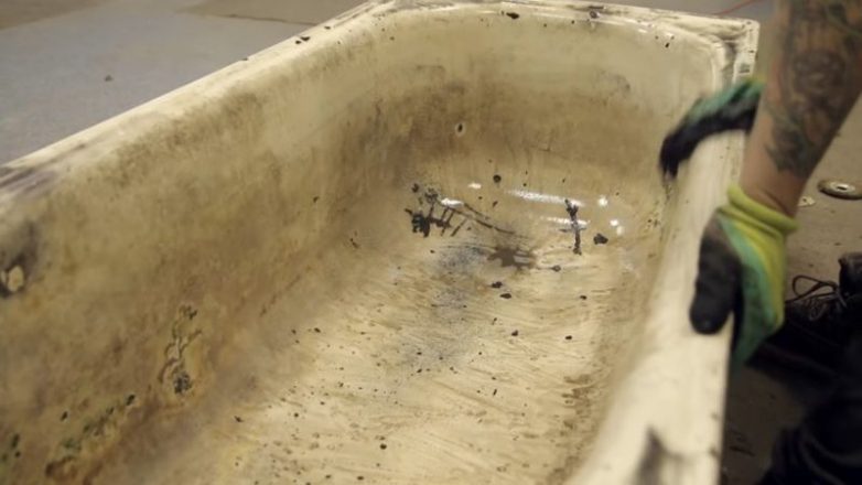 Вот так выглядела ванна в начале работы. Первым делом мастер вручную убрал все выступающие куски грязи, цемента и т. д.