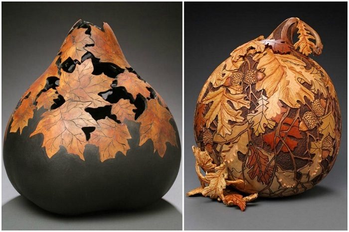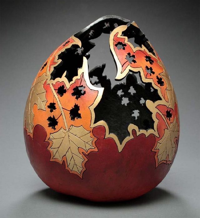 Любимой же темой Мэрилин является осенняя листва, которую она изображает непосредственно на тыкве, а иногда вырезает ее отдельно из кожуры и крепит к готовой композиции, для создания объема и рельефа.