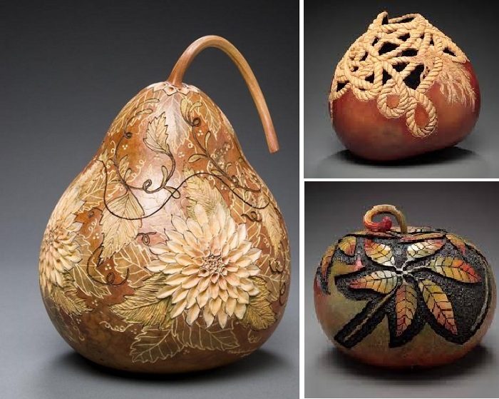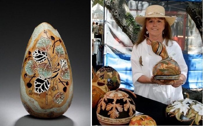 Хитросплетением листьев, цветов и ягод, фигурками фантастических рыбок, птичек и бабочек покрывает американская художница Мэрилин Сандерлэнд свои тыквенные скульптуры, превращая обычный овощ, выращенный на грядке, в шедевр.