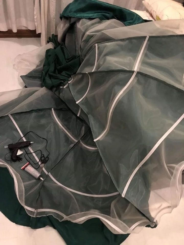 Изначально девушка наняла дизайнера, но результат ее не устроил, поэтому она решила выполнить все этапы самостоятельно. Все началось с покупки 12 метров ткани, кринолина, корсетных косточек и кристаллов Swarovski.