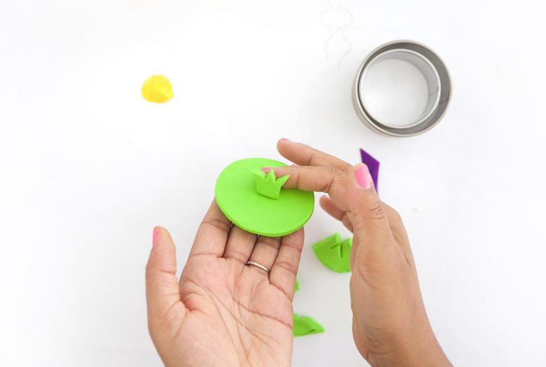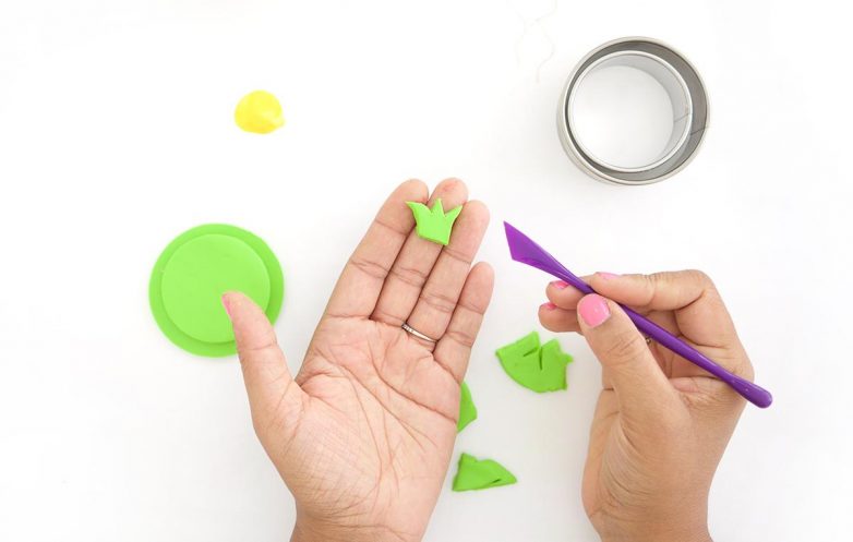 С помощью форм выдавите кружочки из салатной полимерной глины. Запеките их, следуя инструкциям производителя. Склейте кружки вместе.