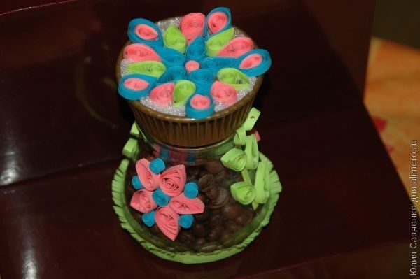 Хочу поделиться с вами своей маленькой работой, которую сотворила вчера вечером. Освободилась баночка из-под кофе, и нужно было срочно куда-нибудь ее приспособить. Решила сделать баночку для сыпучих продуктов с использованием техники «квиллинг».