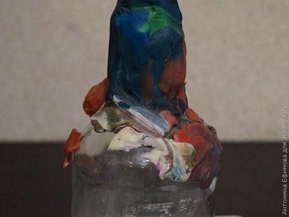 Затем берем пластилин и начинаем обмазывать им всю поверхность бутылки.