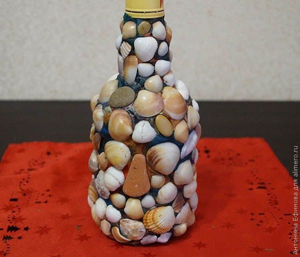 Теперь, когда бутылка полностью обмазана пластилином, можно начинать ее декорировать нашими приготовленными ракушками.