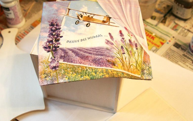 Подбираем салфетку с понравившимся рисунком. Я выбрала салфетку в стиле прованс, одинаковую для короба и для досочки, тут вы можете дать волю своей фантазии. Моя салфетка будет полностью покрывать стенку короба, если вы предпочтете мелкий рисунок на часть стенки, то необходимо сначала покрыть краской поверхность цвета фона вашей салфетки, чтобы впоследствии не было заметно разницы или же потом докрасить фон в цвет салфетки, как мы будем делать с доской далее.
