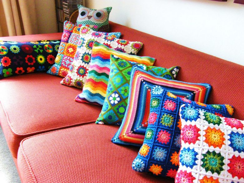 Вязаные подушки с помощью спиц или крючка (не требуют особых навыков и умений, поэтом идеально подходят для начинающих мастериц).