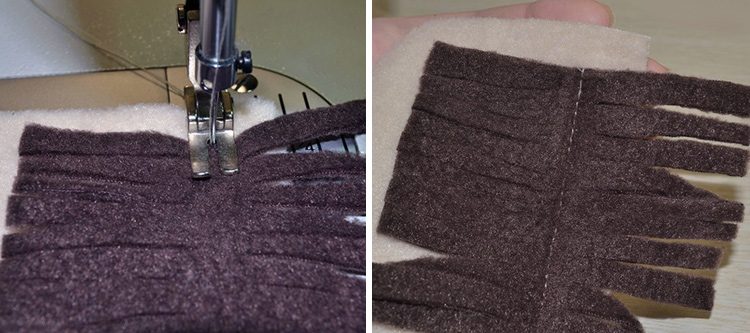 3. Первый элемент пришейте к основанию, отступив на один сантиметр от края (не забудьте отогнуть бахрому в одну сторону).