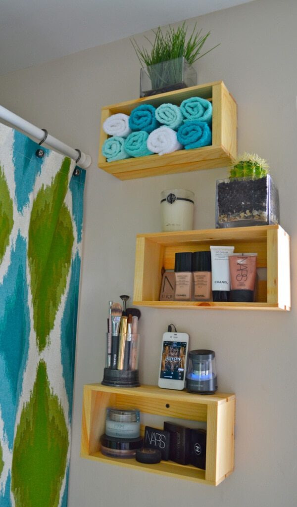 Для этих маленьких полочек хватит места даже в самой тесной ванной комнате. Положите в них яркие полотенца в тон со шторкой для ванны – помещение заиграет новыми красками!