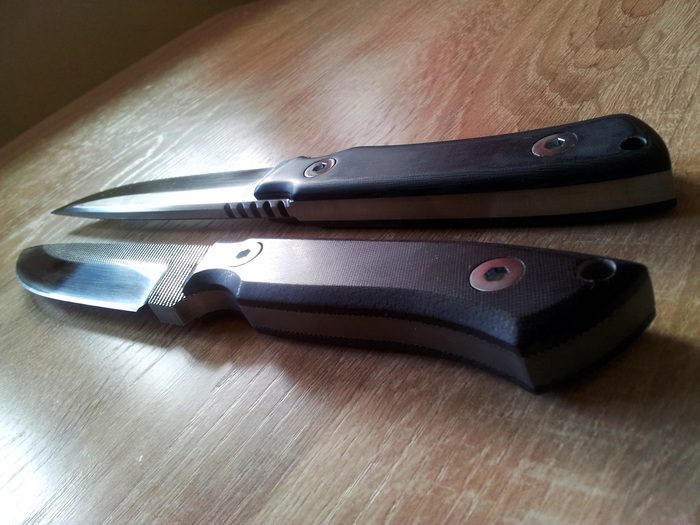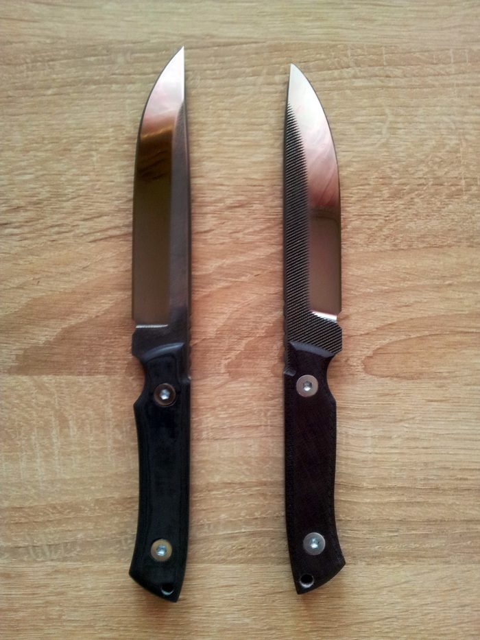 Два нехолодных ножа (шибко толстые) полочной направленности (ибо насечка и толщина) с зонной не проявленной закалкой, с твердостью закаленной части в 62-64 HRC.