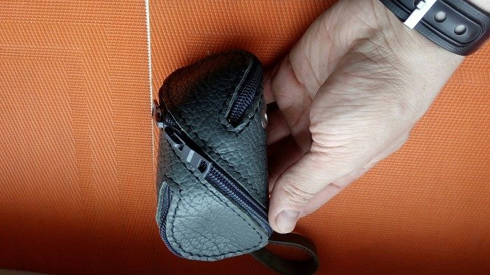 вырезаем кракозябру. к краю сначала приклеиваем, а потом и пришиваем молнию с двумя бегунками. шов получается один, но вокруг всего куска шкуры. потом делаем отверстия под кольцо для ключей и укрепляем отверстия люверсами( или как там эти штуки называются).