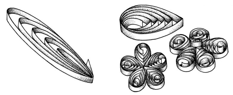 Цветки, состоящие из отдельных лепестков, часто встречаются при изготовлении композиций. Особенность изготовления этих цветков заключается в том, что лепестки должны быть одинаковые по величине. Поэтому круглую спираль вставляем для раскручивания в отверстие трафаретной линейки определённого диаметра. Получаются свободные спирали одинакового размера, которые сжимают, как правило, в форму «капля».