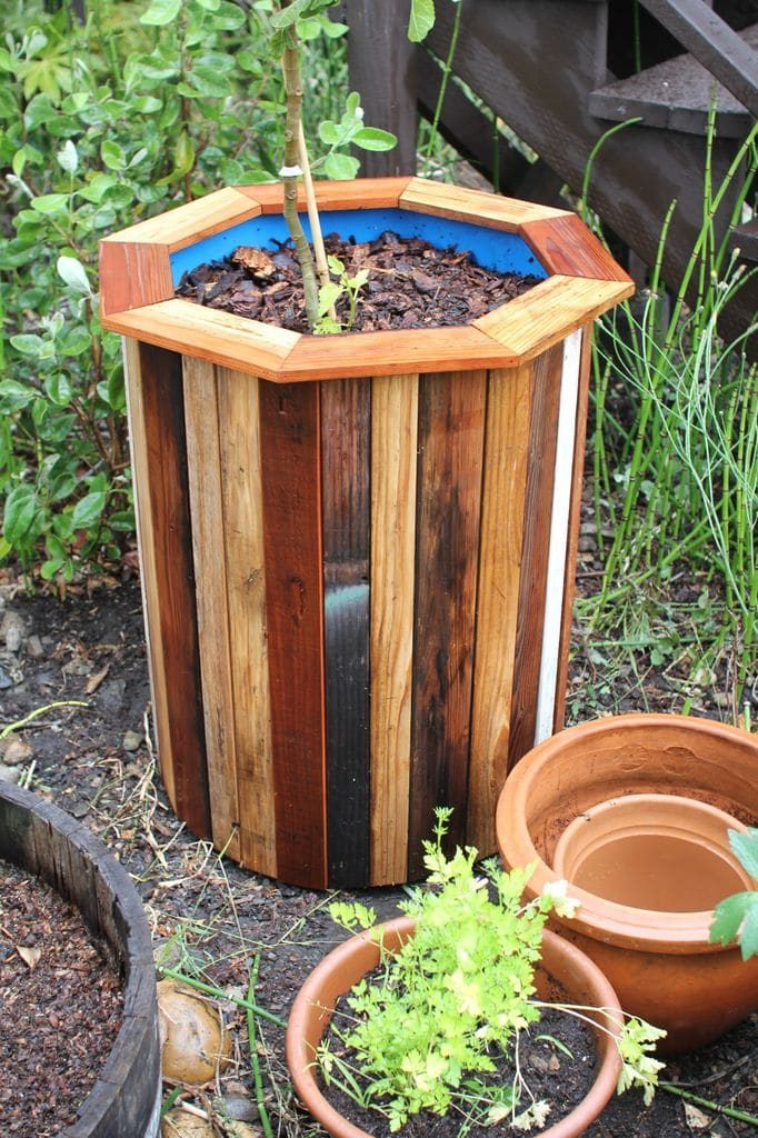 Кроме прочего, газоны должны были украсить сад. Для реализации проекта понадобилось пару старых пластиковых бочек и обрезки пиломатериалов.