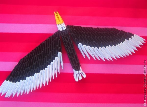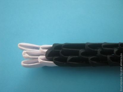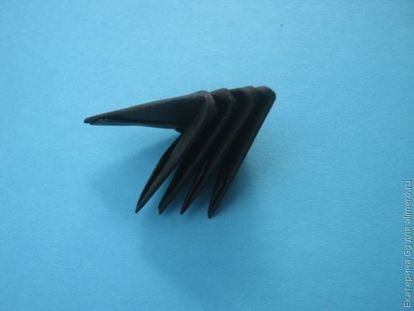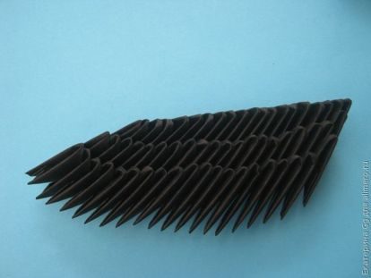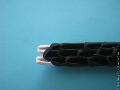 Крыло начинаем делать, как показано на фото. Сначала идут черные модули. В карман предыдущего модуля вставляем следующий модуль. И так друг за дружкой соединяем 20 черных модулей.