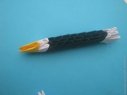 Так же делаем и третий ряд крыла. Как показано на фото. Надеваем первый модуль на два конца предыдущего ряда, а затем, следующий модуль: один кармашек вставляем в предыдущий модуль, а один в модуль второго ряда. И так идем до конца.
