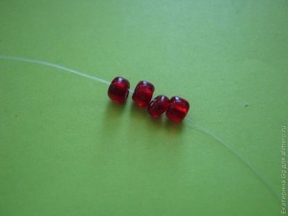 Беру леску. Набираю на нее 1 бордовую бисеринку.