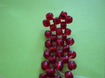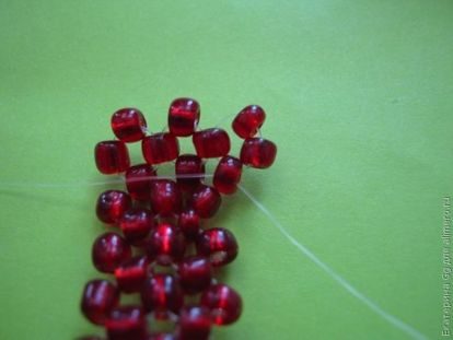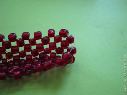 Беру длинный кусок лески (леска слаживается в двое при плетении) и плету на ней цепочку «крестики» из крупного бордового бисера, нужной мне длины.