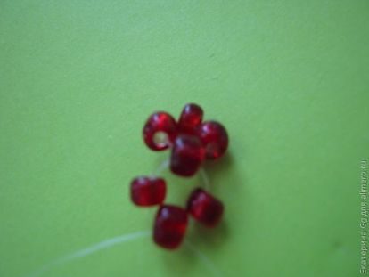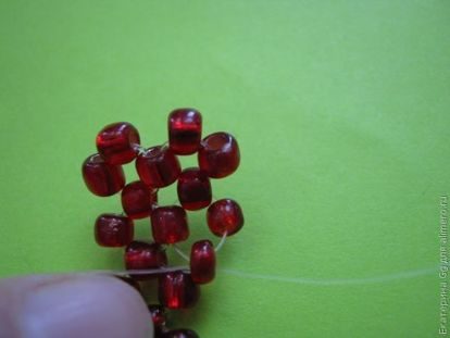 И набираю еще 1 бордовую бисеринку, прохожу вторым концом лески навстречу.