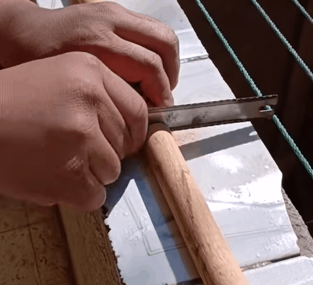 Разрезаем деревянную палку в нужных местах.