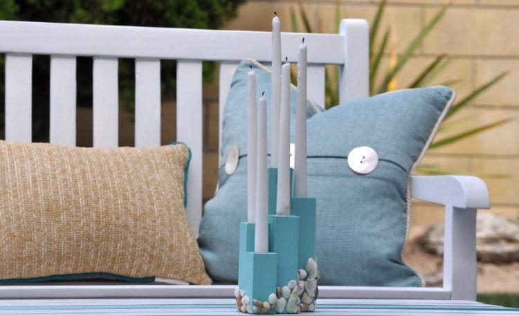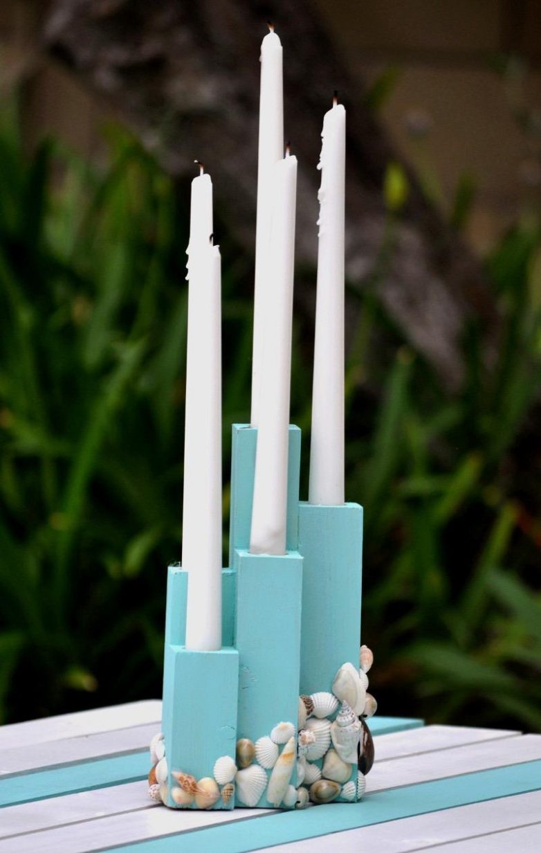 Обработайте все поверхности, углы и грани наждачной бумагой. Покрасьте подсвечник. Мы выбрали морскую тематику, поэтому использовали бирюзовую краску. Вы можете выбрать краску на свое усмотрение.