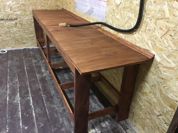Наконец внутрянка зашита и можно делать себе удобно. Мастерим верстак, полочки, вешаем ящички и в конце притараканиваем в мастерскую старенький диванчик.