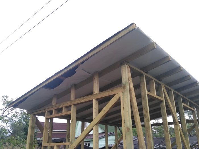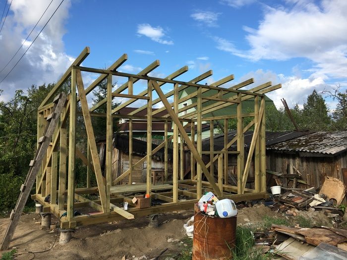 Каркас готов! На этом этапе нужно все замотать в пленку и желательно поскорее накрыть крышу, чтобы возможные дожди на успели сильно промочить дерево.