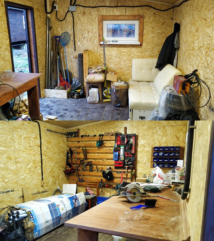 В итоге получилась просторная мастерская, куда вмещается весь инструмент, бассейн, лопаты, краски-банки и все остальные мужские игрушки.