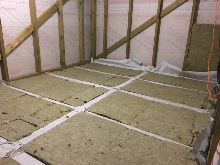 Пол укрепляем листами ОСБ-6, это только для того, чтобы вата-утеплитель никуда не делась. Не забываем все укутать в пленку.