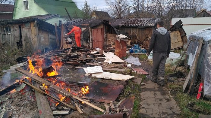 Мусор максимально экологично утилизируем — дерево можно сжечь или отдать бабуле-соседке на дрова, пластик и стекло по мешкам и на строительные мусорки. Железо на металл, разумеется:)