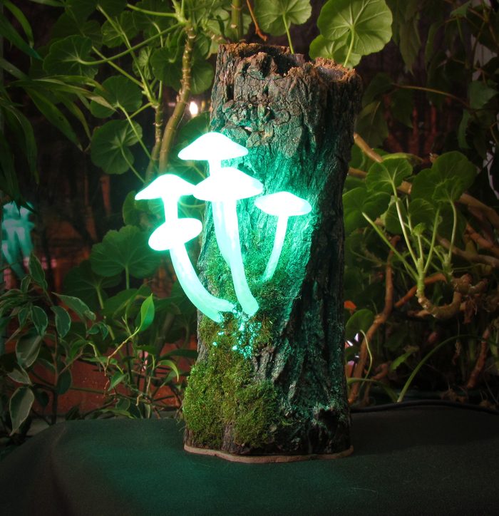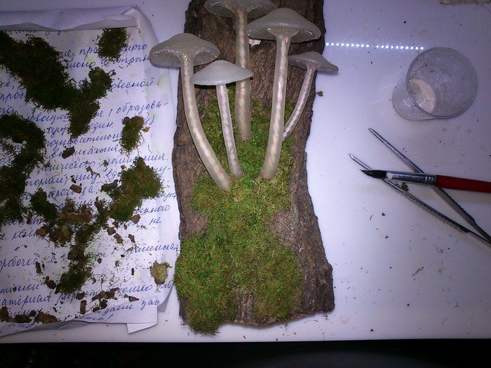Бумага была закрашена морилкой и красками. В вырезанное отверстие вклеиваются грибы