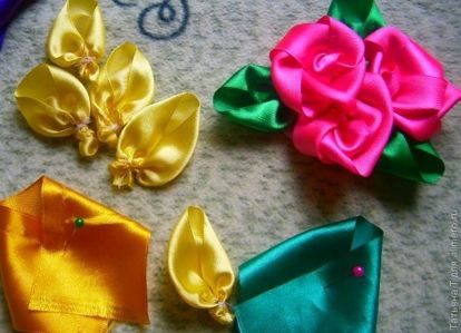 Розы делаем из отрезков ленты длиной 30-45 см. Начинаем как лепестки, а потом заворачиваем остаток ленты вокруг образовавшейся серединки, после каждого витка ленту перекручиваем.
