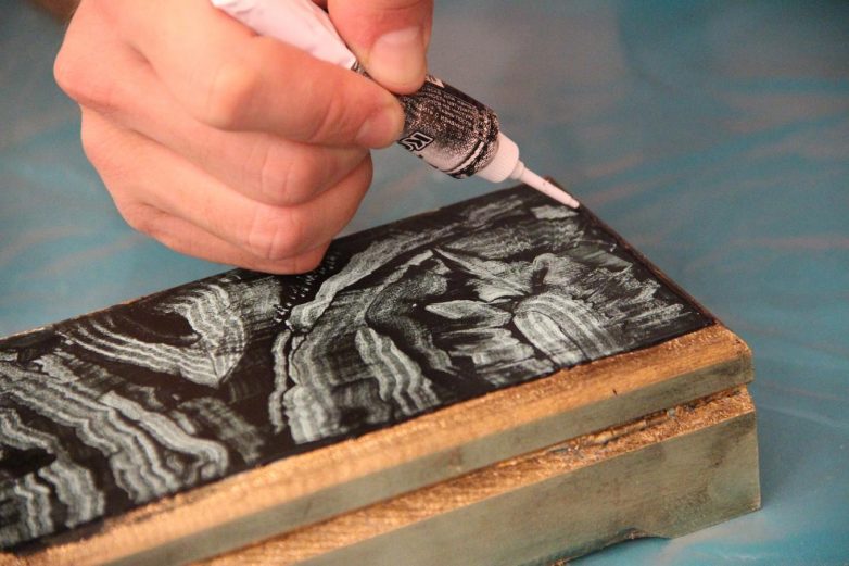 Чтобы придать золотым частям шкатулки «античной» роскоши, покрываем их тонким слоем черного масла.