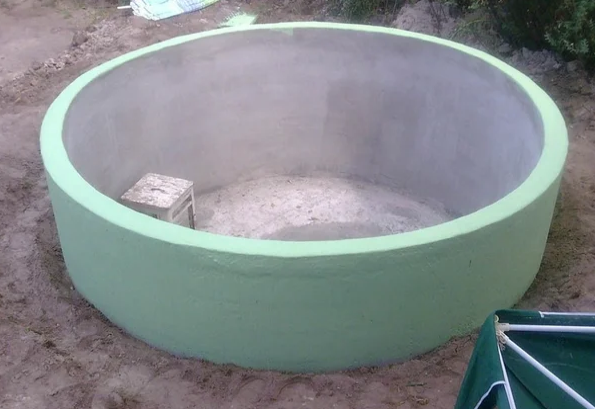 Покупается кольцо для колодца и дно, есть диаметры 2,5, 3, 3,5 метра. Размер на ваше усмотрение, но 3 и 3,5 м — негабаритный груз, при перевозке могут возникнуть проблемы с ГИБДД(или нанять машину сопровождения). Выкапывается яма, делается песчаная подсыпка. Можете вкопать хоть на всю высоту, но мне кажется на пол кольца будет достаточно. На подсыпку укладывается бетонное дно, дальше на раствор ставим кольцо. Далее гидроизолируете, с наружи покрываете фасадной, а внутри краской для бассейнов. Далее зависит все от вашей фантазии, можно установить насос для фильтрации, сделать крышку от попадания листвы, конечно же лестницу и т. д.