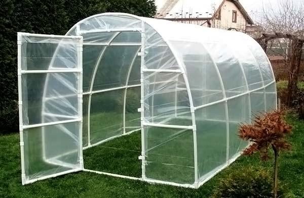 Более серьезное сооружение — сезонная теплица — потребует больше времени и материала. Соединять элементы лучше болтами, чтобы была возможность разобрать конструкцию на зимний период. Оптимальная форма теплицы — арочная. Для ее создания концы труб одевают на полуметровые металлические прутки, вбитые по бокам будущей теплицы через каждый метр. Размеры теплицы зависят от планируемого использования. Теплицу можно установить на фундамент или на грунт. В качестве укрывного материала можно использовать пленку, поликарбонат или агроволокно.