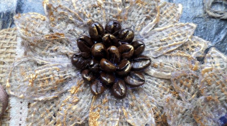 Соединяем все деталиВ качестве украшения выступают бисер, брошки и стразы. Их размещают произвольно по всей поверхности цветка. Крепят как при помощи клея, так и используя нитки. Создав несколько цветков, можно попробовать объединить их на картине-панно. Разные фактуры и грубость цветов из мешковины смотрятся необычно и стильно. Свой туалетный столик можно украсить вазой, обшитой кружевами и цветами из мешковины.