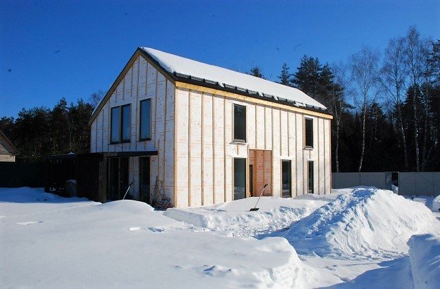 Стены, отделка, переездУже через три дня после окончания полировки бетонного фундамента начался монтаж коробки дома. Домокомплект был изготовлен заранее, поэтому простоев не было. Монтаж двух этажей со стенами, перекрытиями, крышей и окнами занял 12 дней. Эту часть дома возводила компания, специализирующаяся только на СИП технологии – единственная, которой я смог доверить свой проект.