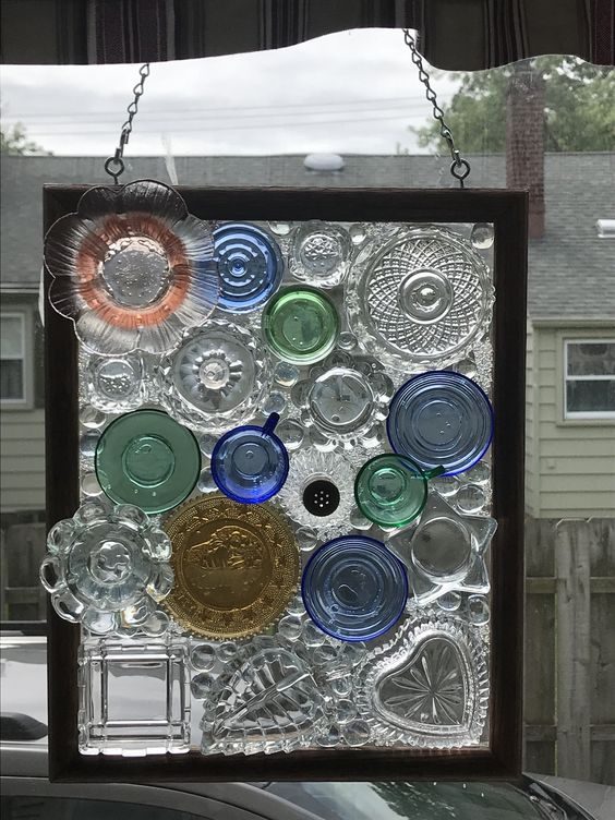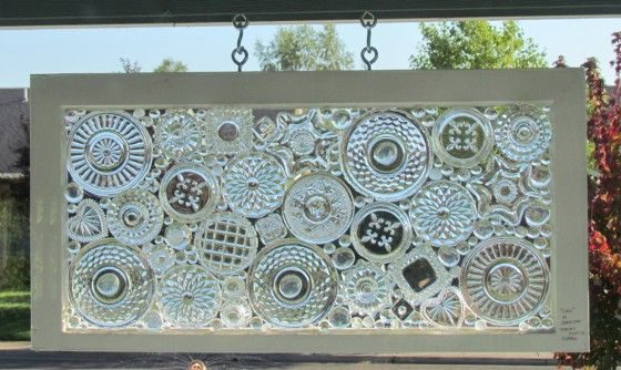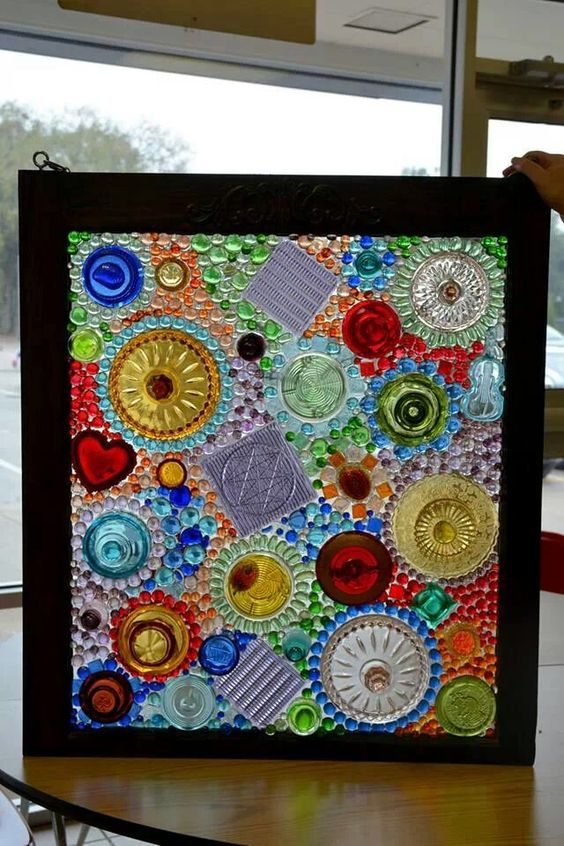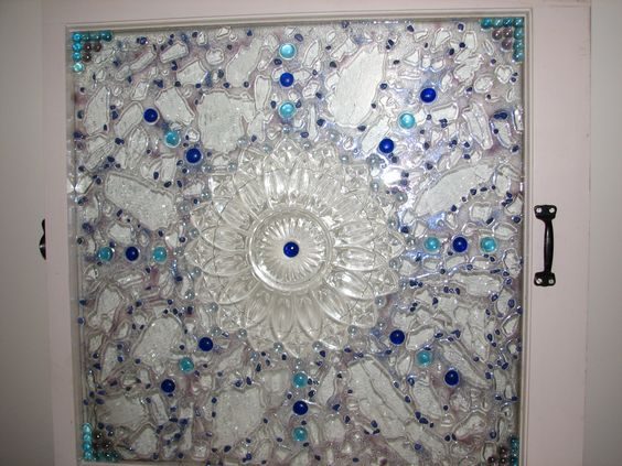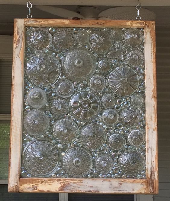 Пробелы заполните стеклянными «камушками» или осколками посуды. Если создаете панно — прикрепите к раме крючки и цепи. Теперь любимая коллекция хрусталя будет радовать глаз, не занимая места в серванте.