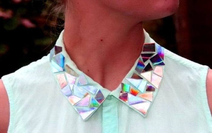 Это очень простая идея, а результат выглядит здорово. Странно, что до этого додумались немногие. Кстати, вы знаете, что мировые дизайнеры декорируют дисками не только воротнички или какие-то небольшие детали, но и целые платья, костюмы, сумки и прочие вещи? Быть в тренде легко!