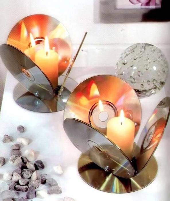 Чтобы сделать небольшие светильники для дома, вам достаточно взять лишь несколько старых компьютерных дисков и светодиодную гирлянду. Ну а процесс сборки будет простым. Если лишней гирлянды нет, можно смастерить и подсвечник.