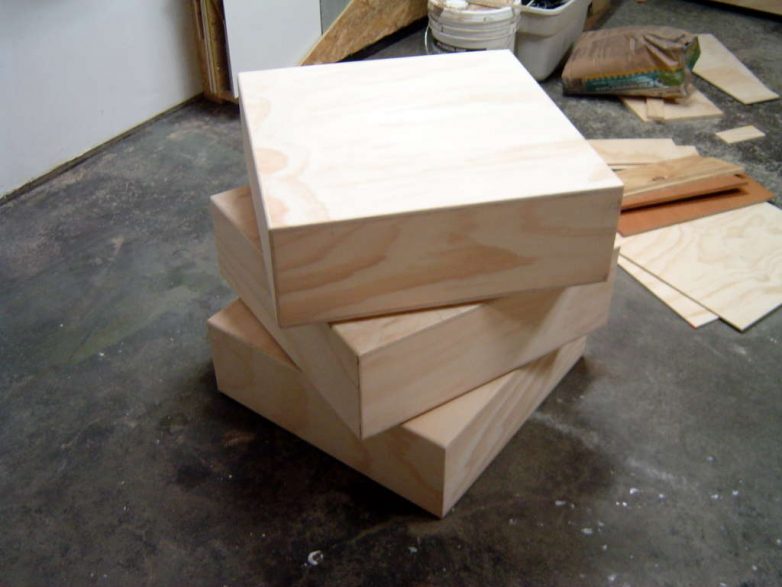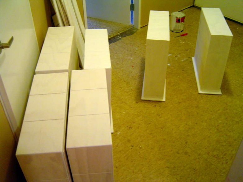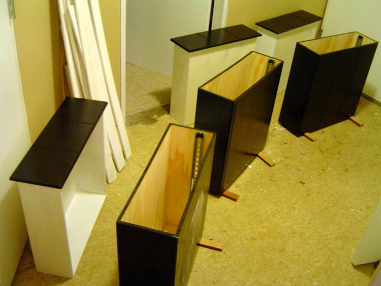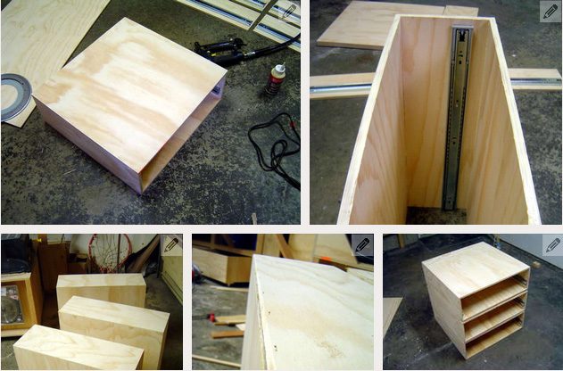 4. Изготовьте три ящика без верхней и передней стенки. Ящики должны свободно входить внутрь секций. Нижнюю и заднюю стенки можно изготовить из 8-миллиметровой фанеры, боковые — из 12-миллиметровой. Заполните пустоты замазкой и ошкурьте.