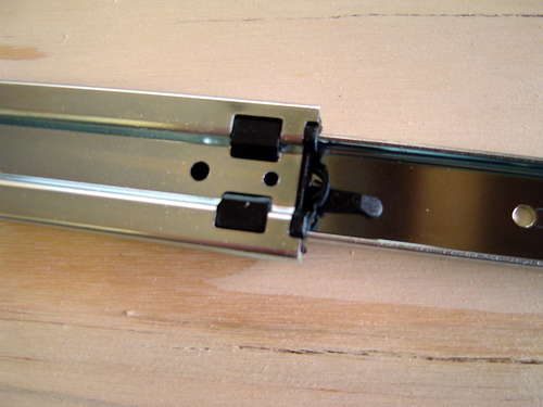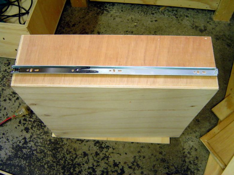 2. Установите направляющие ящиков. Эту операцию лучше всего проводить до сборки секций. Высота направляющих не очень важна, но нужно проследить, чтобы противоположные направляющие находились на одном уровне и были строго параллельны полу. Устанавливая направляющие, нужно отступить от передней кромки боковин по 5 мм.