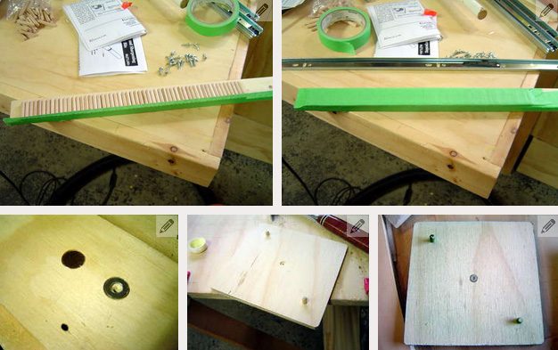 12. Установите поворотный механизм. Мебельные поворотные механизмы низкопрофильны — их высота всего 9 мм, но нам такой зазор между секциями ни к чему. Поэтому нужно разметить контуры механизма на нижних и верхних гранях секций и сделать 3-милиметровые углубления на каждой из них. Чтобы чётко центровать поворотный механизм, одну его часть можно закрепить шурупами, а вторую посадить на клей. Пока клей сохнет, можно подрегулировать положение одной секции относительно соседней.