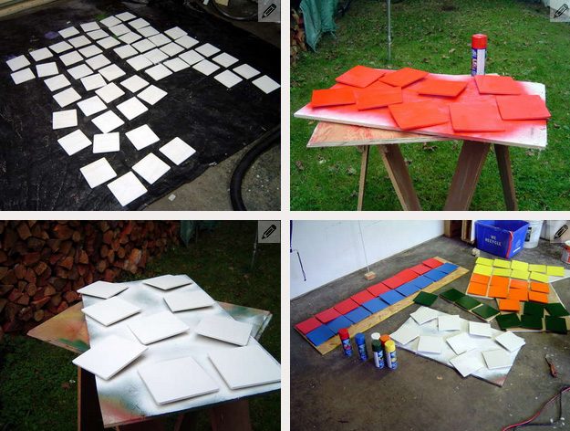 10. Предварительно загрунтуйте квадраты и тщательно окрасьте их лицевую сторону и боковые грани. Комбинация цветов может быть любой, но мы остановились на классических цветах: белом, желтом, оранжевом, красном, зеленом, синем. Краску желательно нанести в несколько слоев.