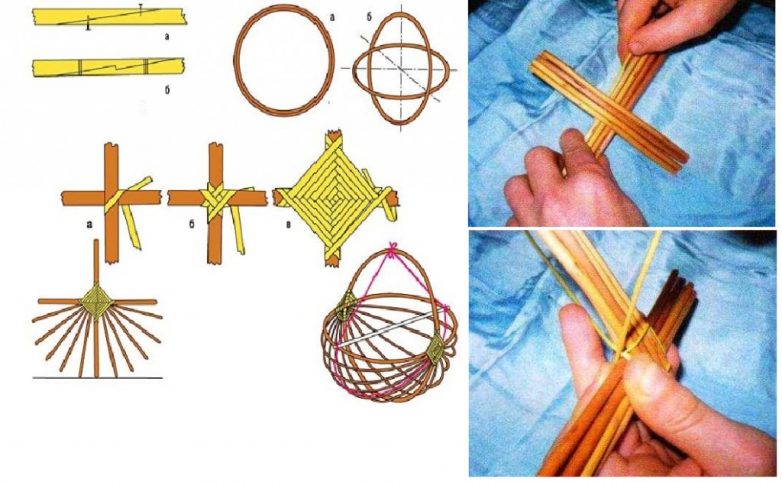 1. Плетение дна начинается с того, что необходимо взять 8 прутиков. В половине из них делают по отверстию. Каждое из них составляет 3 сантиметра. Вторую половину веток продевают в данные прорезы. В итоге образуется крестовина.