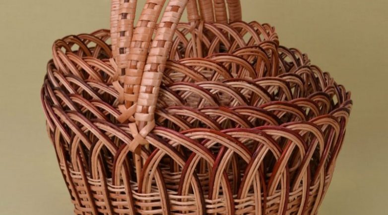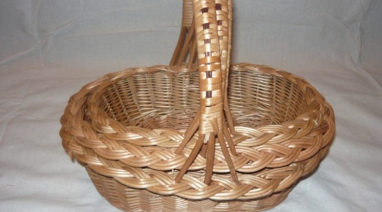 Корзина из лозы готова. Осталось только сделать ручку. Сперва стоит отмерить длину для ручки и выбрать толстую ветку. Ее сгибают и придают ей ту форму, которая подойдет корзине. Концы прута заостряют и вставляют в стенки изделия. Рядом с ручкой следует разместить 6 прутов потоньше. Они огибают основную ветку, что позволяет прочно закрепить ее в плетении. Чтобы мелкие ветки не двигались, их закрепляют при помощи скотча. «Хвостики» прутьев следует скрыть в стенках корзины.