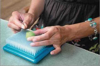3. Переносим бусину на губку и валяем тонкой иглой, протыкая бусину насквозь. Наша задача — скрепить бусину и сделать ее достаточно ровной. До очень плотного состояния валять нет необходимости, так как основная довалка будет произведена в технике мокрого валяния.