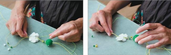 7. Таким же образом нанизываем остальные детали. На концах шнуров можно поместить стеклянные или маленькие валяные бусины. Закрепляем их так же — узелками.