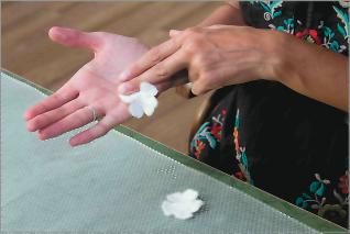 4. Когда все волокна свалялись, не отходят, и слой достаточно плотный и гладкий, можно приступать к вырезанию лепестков. Вырезаем пять лепестков, делая надрезы не очень глубокими (иначе лепесток может отпасть в про¬цессе валяния).