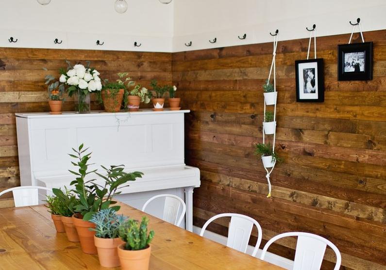 На фото последняя панель выкрашена белой эмалью для дерева и добавлены декоративные крючки, которые, впрочем, оказались практичными: вьющиеся растения в белых горшках смотрятся особенно эффектно на фоне такой деревянной стены.