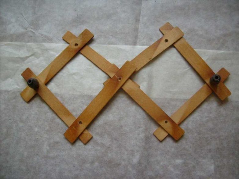 1. Проектирование будущей вешалки. Складываем дощечки двумя ромбиками и намечаем карандашом места соприкосновений. Для идеально ровного сочленения сделайте замеры расстояния между «птичкой» по бокам ромбиков. Затем привинтите в эти места бусинки-штырьки. Так мы получим крепкую опору для дальнейших действий.